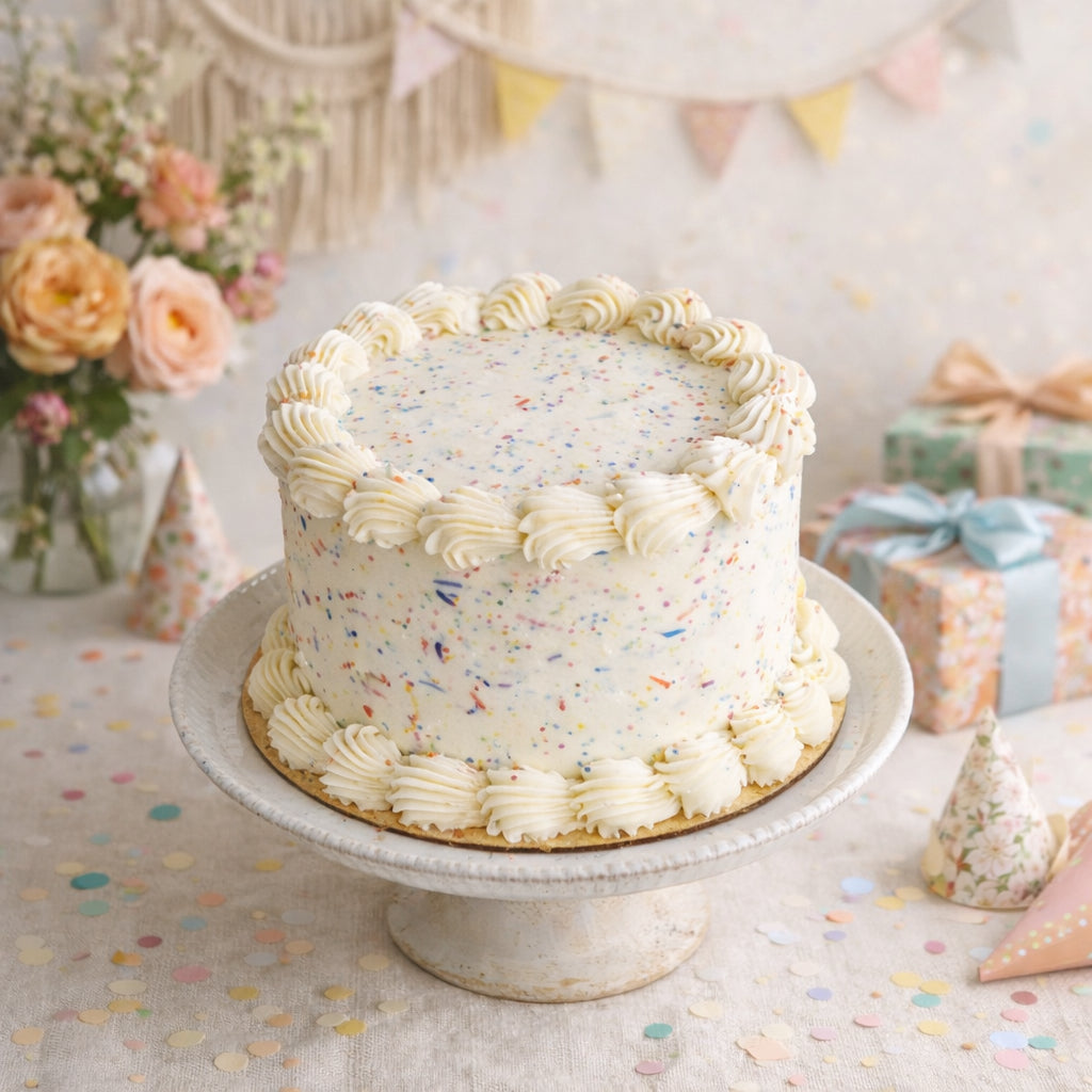 This classic and timeless cake is perfect for any occasion. Light and creamy filling and silky buttercream made from scratch. The Classic cake is an off-white, whipped buttercream color with dye-free rainbow sprinkles & piping.
