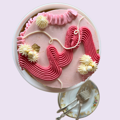 The Antoinette cake has a base coat of soft pink buttercream, made from artificial dye-free colors.