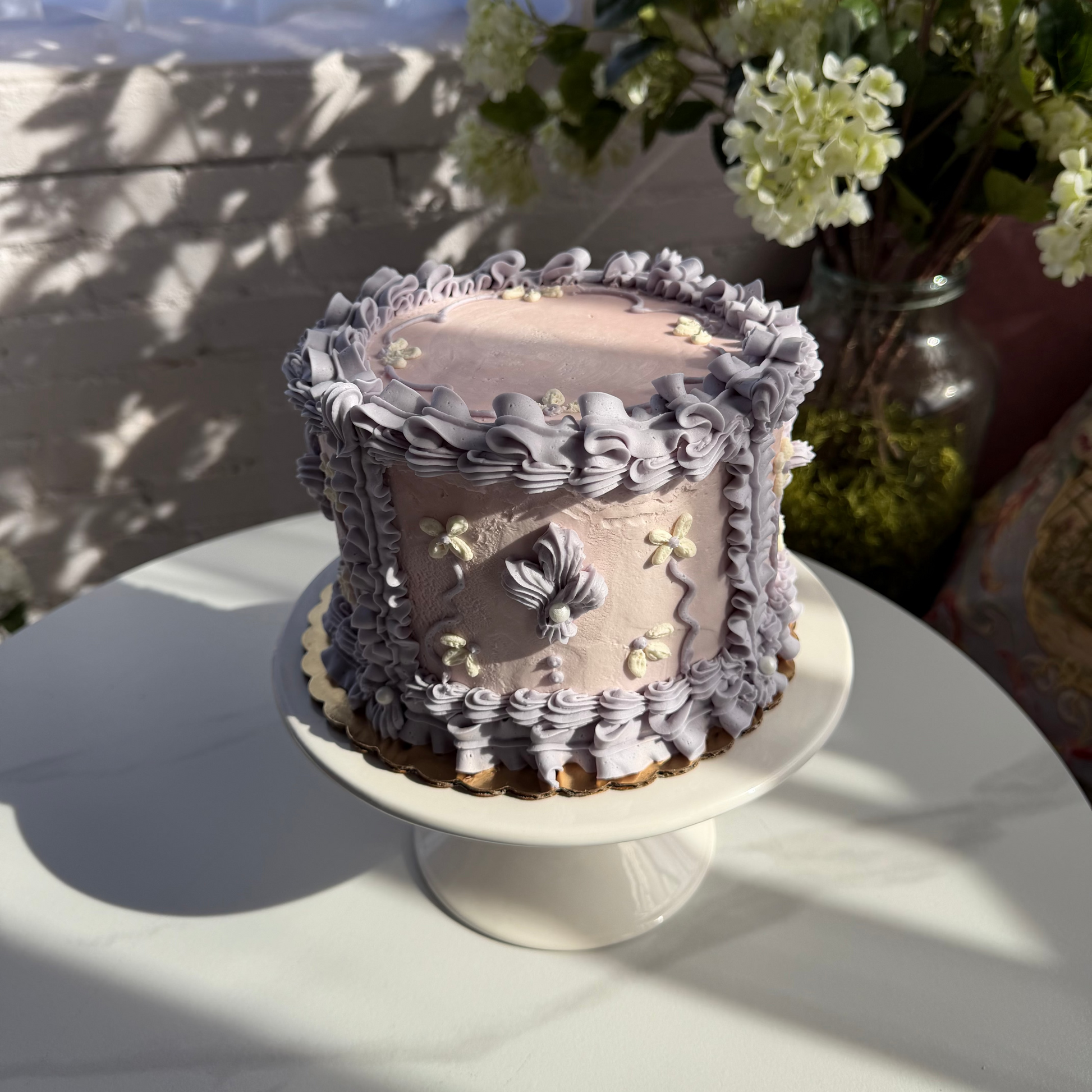 The Victoria cake has a base coat of soft orchid buttercream, periwinkle, white and pastel pink accents made from artificial dye-free colors.